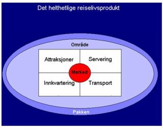De mÄ i tilfelle bli av helt generell karakter. Det viktigste Ä ha klart for seg er at turisme ikke er noen spesifikk nÊring. Turister gir spin-off til alle tjenesteytende og handelsrelaterte nÊringer i en kommune. Stort sett alle i kommunen tjener pÄ turistene; overnattingsstedene, spisestedene, kjÞpmannen, kiosken og bensinstasjonen, gavebutikken og gullsmaden. Alle disse kan pÄ en eller annen mÄte dra nytte av turisten som kommer innom bygden. Det viktige er Ä vite hvorfor turisten gjÞr en stens, og Ä innrette markedsfÞringen som turiststed etter dette. En av kardinalfeilene de fleste begÄr er Ä markedsfÞre flotte hotelrom. Slike finnes over hele verden, og er knapt noe konkurransefortrinn. Turisten tar det for gitt at det finnes et bra sted Ä bo nÄr han/hun kommer til et sted. Overnattingssted er et av basisbehovene som turisten forventer Ä fÄ dekket. Det samme gjelder spisesteder. Turisten jakter pÄ det spesielle som kan fortelles til naboer, familie og venner ved hjemkomst. Kort sagt, er det viktig at turisten er tilfreds med hele pakken som blir tilbudt. Denne pakken er det vi kan kalle reiselivsproduktet, og denne kan sammenfattes i en enkel og generell figur: